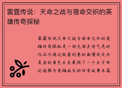 雷霆传说:天命之战与宿命交织的英雄传奇探秘