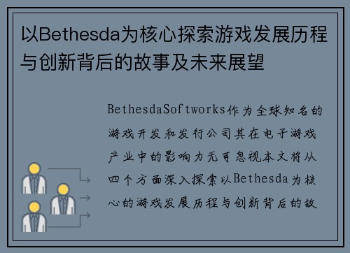 以Bethesda为核心探索游戏发展历程与创新背后的故事及未来展望
