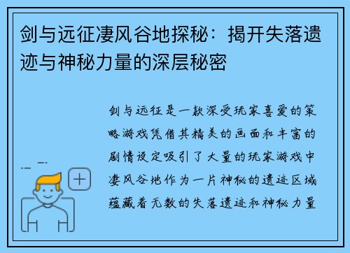 剑与远征凄风谷地探秘:揭开失落遗迹与神秘力量的深层秘密