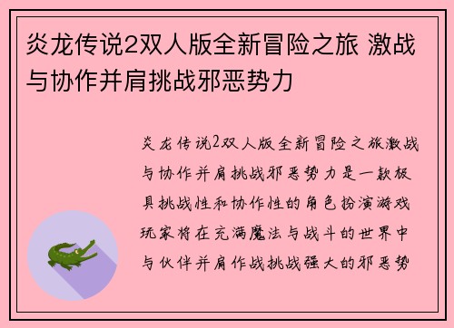 炎龙传说2双人版全新冒险之旅 激战与协作并肩挑战邪恶势力